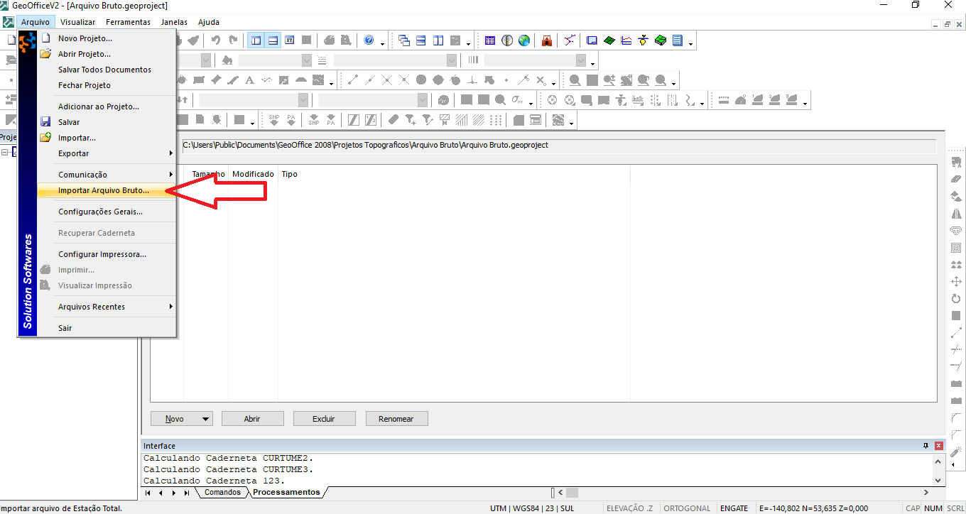 Com um projeto criado no GeoOffice, entre no Menu Arquivo / Importar Arquivo Bruto, conforme imagem abaixo.