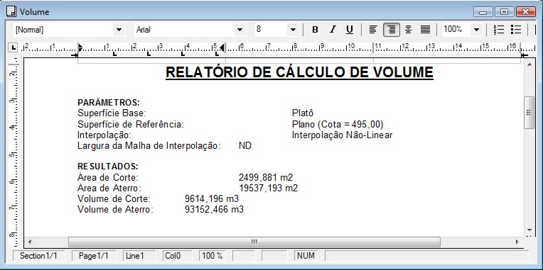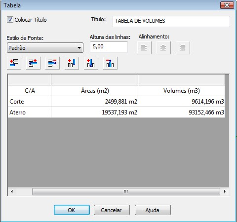 Veja abaixo um exemplo de sua área representada graficamente com os volumes de Corte e Aterro junto a Tabela.