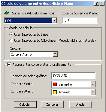 Há a possibilidade de representar á área de Corte e Aterro graficamente no desenho. Caso deseje, selecione esta opção. Será criada uma camada com o nome $VOLUME no Gerenciador de Camadas do Desenho para armazenar as áreas representadas. As cores “Vermelho” para Corte e “Amarelo” para Aterro são sugestivas e podem ser configuradas.