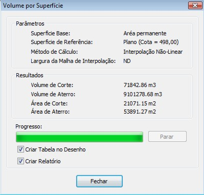 Em seguida será apresentada essa janela informando os parâmetros do cálculo, seus volumes de Corte e Aterro em m3 e suas respectivas áreas em m2.