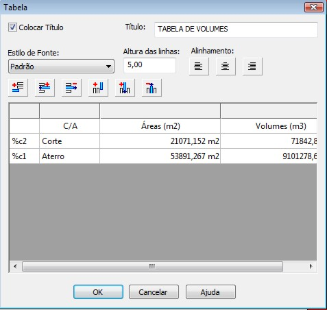 Após o cálculo de volume terminado, terá a opção de “Criar Tabela no Desenho” com as informações do cálculo e também um “Relatório” em texto.